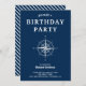 Convide seus convidados com este convite de aniversário náutico moderno com uma bússola branca com tipografia elegante contra um fundo azul marinho. Basta adicionar os detalhes do seu evento neste modelo fácil de usar para torná-lo um convite de tipo único. Sacudir a placa para revelar um padrão de listras azul e branca na parte traseira da placa.