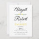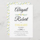 Tipografia escrita à mão flores amarelas simples convite para festas de noivado florais. Mostra seus nomes em uma escrita cursiva tipografia de estilo manuscrito e duas pequenas flores amarelas com folhas verdes em ambos os lados da seringa. O fundo inclui um padrão floral.