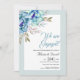 Flores de aquarelas azuis e verdes de menta, convite para noivados florais. Uma adorável design de casamento que inclui flores de aquarela em tons de azul e verde de menta e folhas. A frase "Estamos engajados" está na tipografia da escrita.