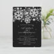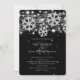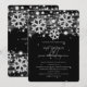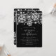 Modelo de convite de "Noivado de Natal em Prata e Preto - Salve a Data" moderno e elegante, com flocos de neve prateados brilhantes e luzes em fundo preto.