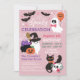 Convide seus amigos para uma celebração assustadora em homenagem ao seu aniversário com este convite de aniversário temático do Halloween com ilustrações bonitinhas de fantasmas, morcegos, um corvo e um crânio com detalhes da teia de aranha, uma abóbora e um cheio de caldeirão de bruxas de lodo roxo. Adicione o nome da aniversariante a rosa! Garota rosa convite de aniversário de Halloween com fantasmas vestindo fantasias, um gato cafetão e morcegos voadores em rosa e roxo. Ghost temeu o convite de aniversário do Halloween para uma aniversariante com um fantasma de bruxa, abóbora, e um corvo sentado sobre um crânio e detalhes mais fofos e amigáveis para crianças.