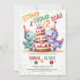 Um convite de festas de aniversário divertido e fofo para dois, com um tema de dinossauro e o título Stomp Chomp & Roar, com uma ilustração de aquarela de dois adoráveis dinossauros vestindo chapéus de festa, lançando sobre um bolo gigante de aniversário. Celebre seus pequenos selvagens com este convite engraçado e arrogante que vai dar o tom para um tempo selvagem.