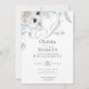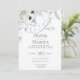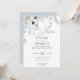 Um spray de elegantes flores de marfim de marfim e pálidas e poeirentas floresce em cascata do topo. Azul empoeirado em branco. A caligrafia de script chic soletra 'Join' com detalhes de convite em uma fonte moderna contemporânea. O contrário é feito em um azul empoeirado complementar. Design criado para o BarefootBride™ por © WhimsicalArtwork™ Personalize texto, estilo de letra, cor e tamanho. Criamos esta modelo para facilitar a personalização com suas próprias informações. Isto é parte de uma suíte coordenada de papelaria de casamento.
