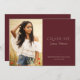 Este anúncio de graduação minimalista apresenta uma simples tipografia e uma paleta colorida de burgundy e creme. Na frente, uma foto vertical é exibida no lado esquerdo. À direita, o "Formando" é escrito na tipografia moderna de todos os bonés, com o nome do formando escrito na caligrafia abaixo. Na base, adicione a escola de formando e o ano de graduação. Na parte de trás, há uma modelo para os detalhes da festa de formatura. A tipografia é escrita em creme contra um fundo vermelho marrom na frente e no verso.