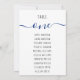 Este é um sinal de assento de mesa de 5 x 7" com nomes de convidados. Na parte superior, há o número da tabela escrito em um guião marinho azul de escrita manual e a palavra Mesa acima, em bonés pretos menores (letras de mão). Sob eles, há os nomes de hóspedes, em letras negras semelhantes.