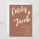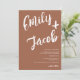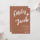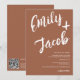 Um convite de casamento moderno, ousado e elegante com nomes personalizados com uma caligrafia de pincel manuscrito em terracota boho e branco. Todo o texto, nomes e cores de fundo são personalizáveis. Um convite simples e minimalista. Adicione seu código qr para um convite de casamento completo com rsvp, detalhes e mais informações.
