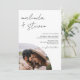 Um convite de casamento moderno, chico e elegante com arco, nomes de script com uma caligrafia manuscrita a preto em branco com uma foto arquivada e outras 3 fotos no verso. Um convite de casamento moderno, tudo em um convite de casamento, com o rsvp, detalhes, acomodações e código qr. Todas as cores de texto, nomes e fundo são personalizáveis. Um convite simples e minimalista.