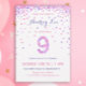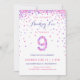 Celebre o aniversário de sua filha de 9 anos com um confete rosa e roxo colorido nesses convites de aniversário de 9 anos! Apresentando os detalhes da festa da sua filha e um "9" em confetti. A parte de trás tem um design de confetti com uma cor de lavanda suave. Este design adorável é super fofo e giro - e perfeito para a garota que ama rosa e roxo!