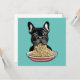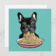 Engraçado buldogue francês comendo macarrão.
