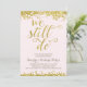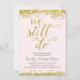 Um convite de festa de aniversário de casamento de 50 anos dourado que apresenta a frase romântica "Nós ainda fazemos" escrita em bela caligrafia com aparência de revestimento dourado falso, confetes dourados falsos na parte superior e inferior do cartão e um fundo rosa claro chique.