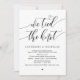 Marque o começo de sua eternidade com elegância usando nosso belo cartão de convite para celebração de elopementos de casamento, preto e branco, tema contemporâneo, "nós amarramos o nó". Perfeito para os casais estendendo sua alegre ocasião, este convite exude sofisticação com uma sugestão de brincadeira, definindo o palco para um evento memorável. Adorado com um tema design de roteiro moderno de eterno, ele adiciona um toque de encanto refinado às suas festividades. Feito por TeeshaDerrick, este convite promete capturar maravilhosamente sua história de amor.