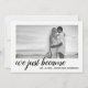 Estes anúncio e recepção modernos minimalistas simples contudo elegantes do casamento do recem casados cardam características sua própria foto com um filtro preto e branco de Zazzle aplicado, junto com o sentimento "nós apenas transformamo-nos Sr. e a Sra." na parte dianteira do cartão com mão rotulou a tipografia do roteiro, assim como seus nomes casados. Para trás dos convites caracteriza a mesma foto com uma folha de prova transparente e um filtro preto e branco, e sua informação da recepção de casamento na parte traseira. Fácil personalizar com seus próprios foto e texto.