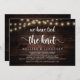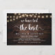 Nós demos o nó, Anúncio de Casamento Simples / Cartão de Convite, em design de Madeira Rústica e Luzes de Corda. Isto é perfeito para o seu casamento e festa de celebração pós-casamento. Adicione os seus detalhes em letra / caligrafia correspondente.