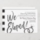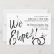 Um divertimento e um roteiro original rotularam o convite costurado especificamente a seu festa de casamento ou comensal cargo-nuptial. Caracteriza as palavras "que nós Eloped" com as alianças de casamento que descansam acima dele. Debaixo disto é o espaço para seus detalhes originais do partido ou do evento. No verso são as listras preto e branco chiques para complementar a parte dianteira.