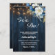 Um belo Convite de Casamento com caligrafia elegante, completado por maravilhosas madeiras azuis, luzes de cordas de jardim e floral azul branco com brilho dourado. Você pode personalizar este cartão com seus detalhes de casamento.