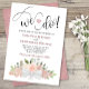 Este convite romântico e elegante apresenta um design floral de cor-d-água rústica com um aglomerado de rosas pintados à mão e flores em tons de rosa, massa, coral e rosa-pincel com folhas de eucalipto folhagem e verde. No topo estão as palavras: "nós fazemos!", escritas em letras modernas com um coração bonito entre elas. A parte de trás do convite é uma cinza azul ou azul de aço marmoreado, com buquê de floração e folhagem amarrada com um arco.