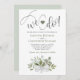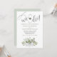 Este convite romântico e elegante apresenta um design de aquarela rústica com um aglomerado de pinturas manuais de folhas de eucalipto e verde. No topo estão as palavras: "nós fazemos!", escritas em letras modernas com um coração bonito entre elas. A parte de trás do convite é uma cor verde-sábio pálida com um buquê de folhagem amarrado com um arco de cetim.