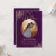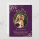 Este convite de recepção de casamento ou festa de depois apresenta um título elegante em escrita cursiva que diz "Nós Fizemos!". Possui um design simples, porém elegante, com letras douradas em escrita cursiva sobre um fundo roxo-pluma profundo, e sua foto em uma moldura oval rodeada por floreios e espirais ornamentados em fólio falso. Perfeito para casamentos secretos ou celebrações que acontecem após uma cerimônia privada. Uma ótima maneira de convidar familiares e amigos para celebrar seu amor.