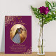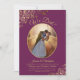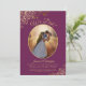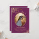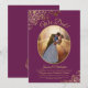 Este convite de recepção de casamento ou festa após o casamento apresenta um título elegante em letra cursiva que diz "Nós Fizemos!". Possui um design simples, porém elegante, com letras douradas em letra cursiva sobre um fundo roxo cassis, magenta ou cor de amora, e sua foto em uma moldura oval rodeada por babados de renda em folha falsa. Perfeito para casamentos secretos ou celebrações que acontecem após uma cerimônia privada. Uma ótima maneira de convidar familiares e amigos para celebrar seu amor.