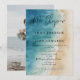 Este convite de casamento de fuga para a praia do oceano azul em aquarela elegante pode ser personalizado com suas informações em tipografia moderna e uma foto especial no verso. Projetado por Thisisnotme©
