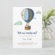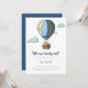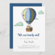 É bom esperar um convite de chá de fraldas de menino com uma ilustração de um filhote de urso em um balão de ar quente flutuando no céu. Ilustrada e projetada por Patricia Alvarez.