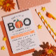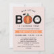 Convite de aniversário de Halloween para uma criança com Our Little Boo escrito no topo com uma abóbora substituindo um O e um fantasma dançando no outro. Acima voa um morcego entre as estrelas contra um fundo cor-de-rosa.