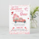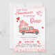 A nossa querida é um convite à "Turning One" personalizável com fundo cardíaco, um caminhão de fazenda vermelha com balões cor-de-rosa e texto vermelho e rosa.
