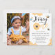 É o primeiro aniversário da sua abelha de mel, comemorar com um doce convite de na moda! Torne-o mais especial com uma foto da sua lindinha de mamangabas, modelo de convite moderno, e imagens de vassouras de abelhas, favos de mel e colmeias. Bem-vindos amigos e família para se juntarem à celebração zangada!