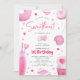 Nosso pequeno Convite para primeiros aniversarios. Design apresenta uma bonito fronteira de doces cor-de-rosa, corações e um modelo de festas bonitinho que é fácil de personalizar com seus próprios detalhes.