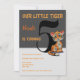 Um convite bonito para a festa de aniversário de 5 de uma criança, com um filhote de tigre bonito na frente de um grande número 5 (a idade), sob o título "Nosso Pequeno Tigre". Todo texto é laranja, exceto a idade, que é preto.