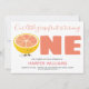 Nossa pequena toranja está fazendo um primeiro convite de aniversário de bebê. Este convite é cor-de-rosa, branco e preto com a palavra "Um" em letras grandes e um desenho animado de uma metade de toranja, sorridente como a primeira letra da palavra. Personalize este convite, adicione-o ao seu carrinho e feliz aniversário ao seu bebê incrível!