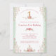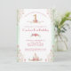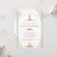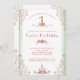 Um convite de conto de fadas doce, com uma delicada flor, rosa e verde, com o ouro 1 e uma pequena princesa, nadando no fundo. A parte de trás do convite tem design floral correspondente. Design© Rosalind Moore, Designs de Cherry Lane.