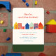 Convite neutro de chá de fraldas com ilustração de uma fileira de casas com paleta de cor rosa, azul, vermelha, verde, laranja e amarela.