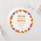 chá de fraldas temático "Nova criança no bloco" com borda de casas e prédios coloridos em cores brilhantes com texto no centro.