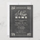 convite de festas simples, romântico e chic para uma nova casa apresenta uma fronteira listrada, desenhos feitos à mão de flores e uma elegante tipografia de estilo vintage. Fundo de estilo de quadro negro suave com aparência texturizada rústica e cores de giz branco / marfim macio.