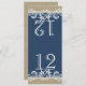 Projeto de renda azul marinho semelhante a uma guirlanda do mar, altere o número para cada mesa e encomende individualmente para que os números da mesa sejam coordenados com os convites. Dobrado ao meio, torna-se um cartão de número de mesa de 4" x 4 5/8".