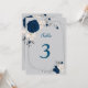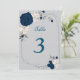cartão de número da mesa com flores azuis marinho e brancas em uma moldura geométrica