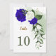 belas flores azuis e brancas reais com algumas folhas verdes e cartão de número de mesa dourado