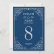 Convites de casamento elegantes e glamourosos inspirados pelo estilo antigo de arte deco e pelos vinte e poucos anos. O design de convite apresenta um esquema de cor azul e prata/cinza de platina, quadro decorativo do ornamentado, texto personalizado e um padrão gráfico no verso.