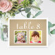 Os modernos e únicos cartões personalizados de números das mesas de casamento apresentam fotos de infância da noiva e do noivo numa idade que corresponde ao número da tabela. Para personalizar: digite o número da tabela, clique em "alterar" pelas fotos padrão para carregar suas próprias fotos digitais ou digitalizadas e adicione esse cartão de número de tabela individual ao seu carrinho de compro. Repita para todos os números de tabela necessários. Texto personalizado de script branco em um fundo de papel kraft marrom rústico.