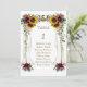 Desenho de casamento elegante com dosel floral de outono, apresentando dosel de madeira com efeito aquarela, buquês de girassóis, rosas borgonha e folhagens. Use a ferramenta Personalizar para adicionar suas informações. Para itens correspondentes, visite minha Coleção de Casamento Botânico com Dosel.
