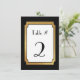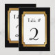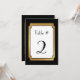 Número de mesa de cartão plano de recepção de casamento personalizado e elegante. Feito em um belo estilo Art Déco com moldura preta em torno de uma moldura mais fina de tom dourado que faz a borda da área de texto branco. O texto preto está pronto para ser personalizado para cada mesa no seu casamento.