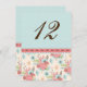 Lindo cartão de número de mesa de recepção de casamento, com uma mistura colorida de flores corais e azuis, na metade inferior do cartão, e um padrão de bolinhas azul ovo de robin, no topo. Lindos produtos de casamento para combinar estão disponíveis. Personalize o número para cada mesa na sua recepção.