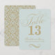 Cartão de caligrafia chique elegante pastel turquesa azul e dourado com um monograma floreado e elementos de design de pergaminho, incluindo belo padrão damasco no verso do cartão.