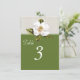Lindo cartão de número de mesa de recepção de casamento feito em verde, com um fundo de linho marfim e renda no topo. Uma bela obra de arte vintage de uma magnólia branca em flor decorada no topo do cartão, na frente e atrás. O texto em branco é totalmente personalizável e pronto para personalizar para cada mesa na sua recepção. Um belo complemento para o nosso conjunto de casamento Southern Magnolias.