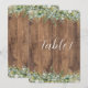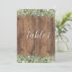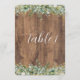 Adicione um toque botânico coeso às mesas da sua recepção com esses elegantes números de mesa que apresentam folhagem de eucalipto, flores brancas, detalhes em ouro e estilo de fundo de madeira.