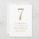 A carta de número da mesa de casamento de ouro elegante e na moda apresenta um belo design de monograma minimalista. O texto personalizado e o número da tabela podem ser totalmente personalizados com os nomes da noiva e do noivo e a data do casamento. Nota, cada cartão de número de tabela deve ser personalizado e adicionado individualmente ao carrinho de compro (1,2,3...etc.). Por favor, compre nossa Coleção de Casamentos Dourados Clássicos Elegantes para coordenar designs.
