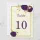 cartão personalizável elegante de números de tabela flores roleais roxas com algumas folhas douradas cartão de número geométrico
