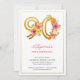 convite de aniversário 90 com o número de ouro 90 decorado com flores bonito. Design feminina e elegante com arranjos florais de aquarela em tons de laranja amarelo rosa e roxo. Perfeito para comemoração de 90, almoço de aniversário de primavera ou verão, festa de chá de jardim etc.
