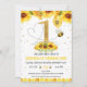 Os girassóis doces e as abelhas temem o primeiro convite de aniversário da menina, com um grande número de folhas de ouro falsas, alguns arranjos florais de girassol, abelhas e linhas de voo de corações. O design também apresenta alguns pontos falhos dourados brilhantes e um padrão de mel.